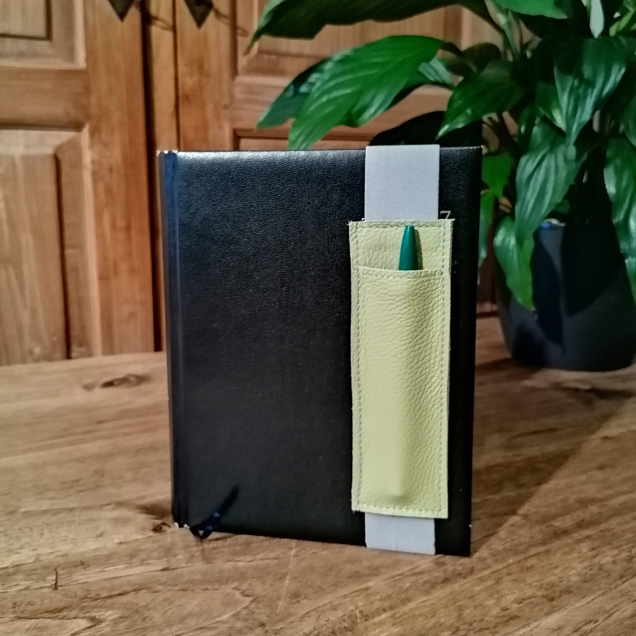 lederen balpenhouder met elastiek om rond agenda te plaatsen.
